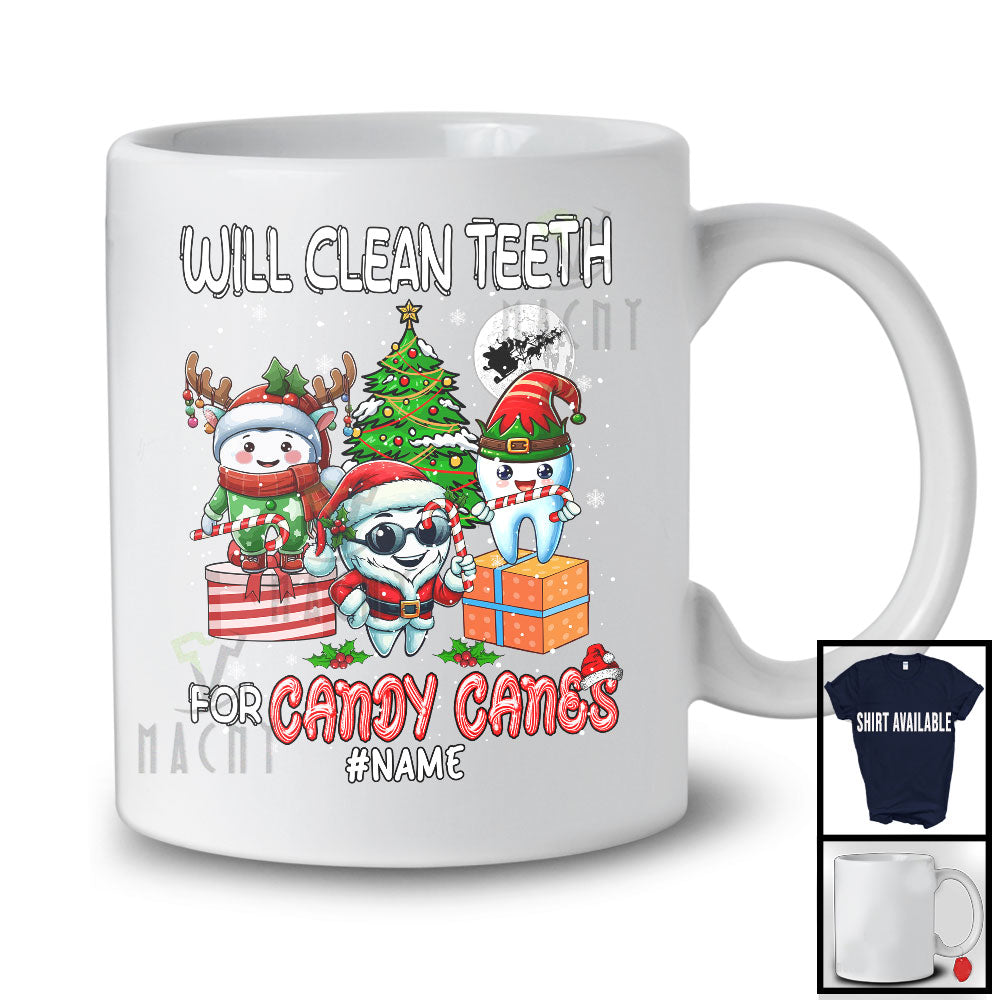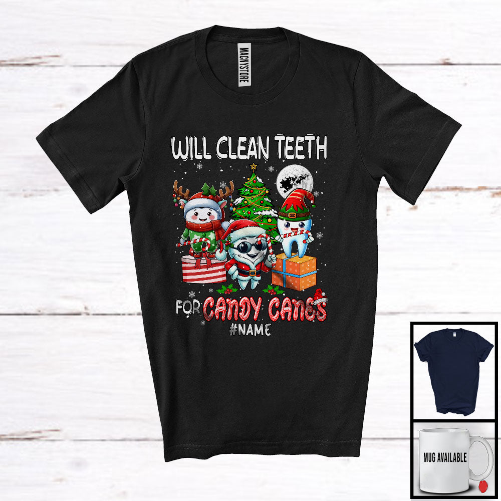 Personalized Will Clean Teeth For Candy Canes; Lovely Christmas Three Teeth; Custom Name Dentist T-Shirt. This cotton t-shirt is a durable staple product with a classic fit. One of the most popular items, it has a relaxed style made for everyday and casual wear.