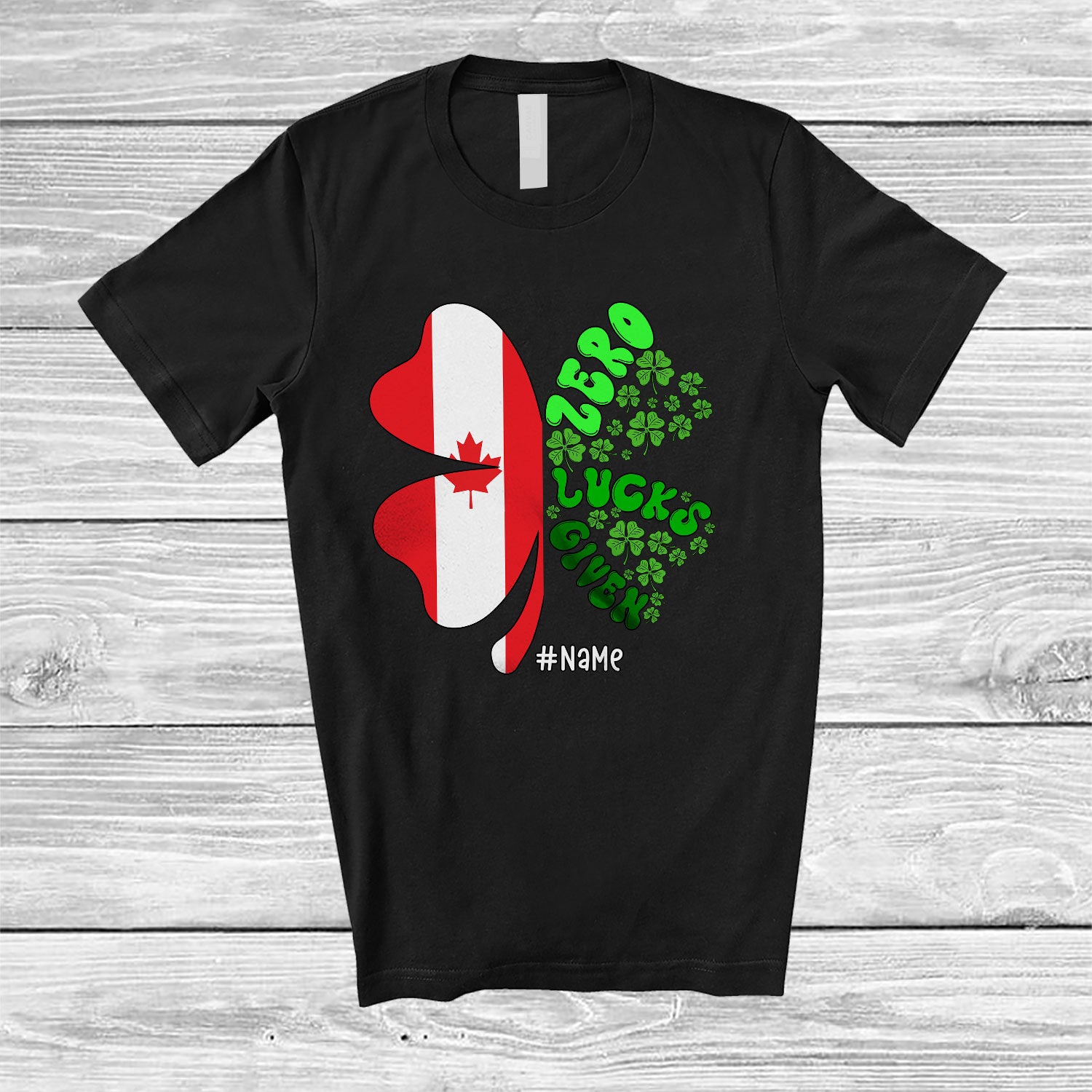 Personalized Zero Lucks Given; Proud St. Patrick's Day Lucky; Custom Name Canadian Flag Shamrock T-Shirt. This cotton t-shirt is a durable staple product with a classic fit. One of the most popular items, it has a relaxed style made for everyday and casual wear.