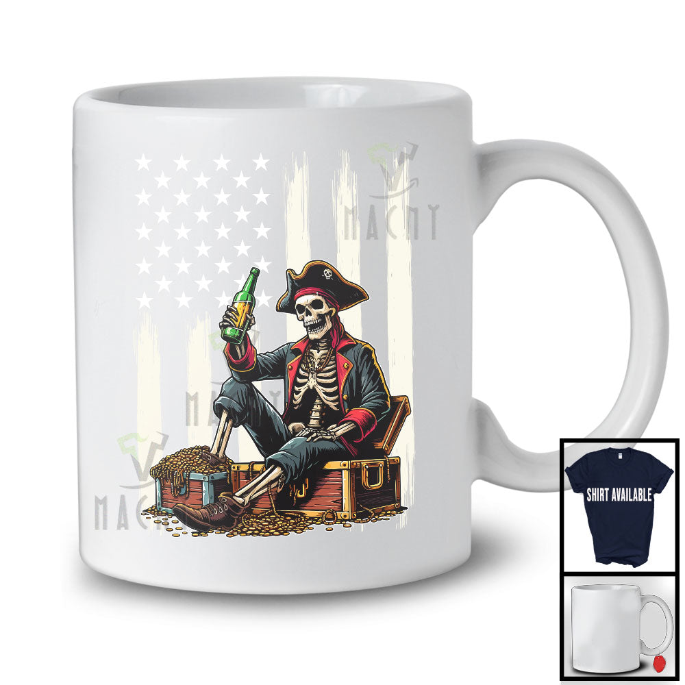 Pirate Skeleton Drinking Treasures, Humorous 4th Of July American Flag Pirate, Patriotic Lover T-Shirt