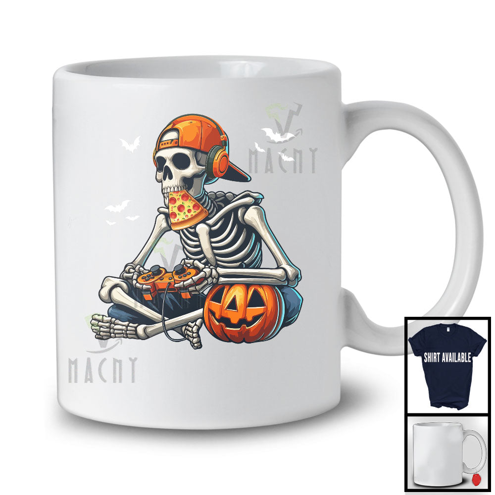 Skeleton Eating Pizza And Playing Video Games; Scary Halloween Pumpkin; Pizza Food Lover T-Shirt. This cotton t-shirt is a durable staple product with a classic fit. One of the most popular items, it has a relaxed style made for everyday and casual wear.