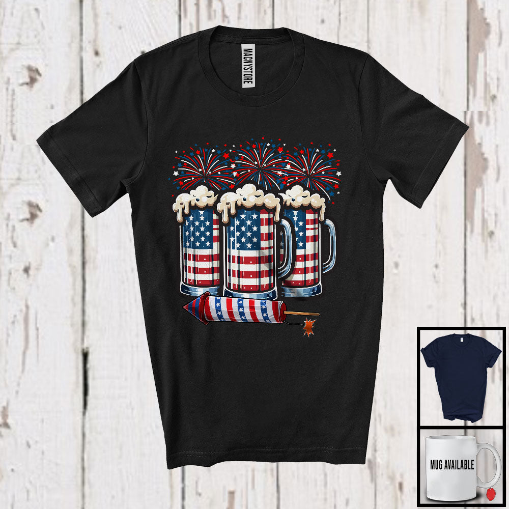 • Three Beer Glasses Firecrackers, Amazing 4th Of July American Flag Fireworks, Drinking Drunker T-Shirt. This cotton t-shirt is a durable staple product with a classic fit. One of the most popular items, it has a relaxed style made for everyday and casual wear.