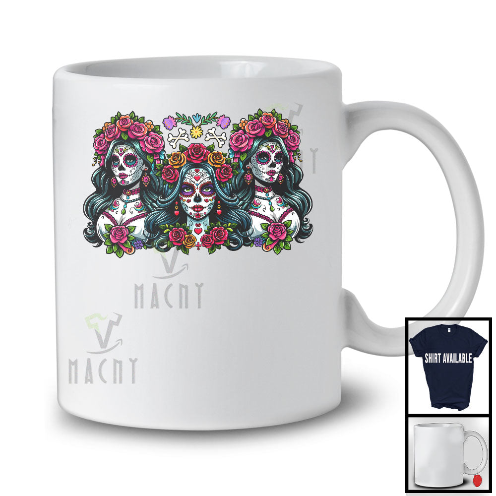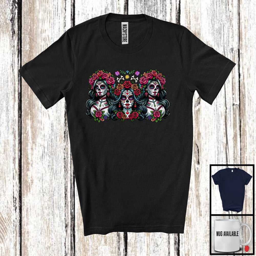 new MacnyStore - Three Sugar Skull Flowers; Lovely Dia De Los Muertos Squad Sugar Skull; Women Mexican Group T-Shirt – Macnystore
