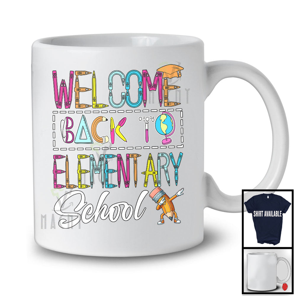 • Welcome Back To Elementary School, Colorful Back To School Last Day, Dabbing Pencil Students T-Shirt. This cotton t-shirt is a durable staple product with a classic fit. One of the most popular items, it has a relaxed style made for everyday and casual wear.