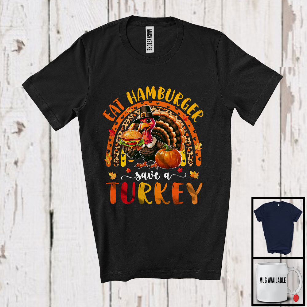 Eat Hamburger Save A Turkey; Humorous Thanksgiving Turkey With Hamburger; Leopard Rainbow T-Shirt. This cotton t-shirt is a durable staple product with a classic fit. One of the most popular items, it has a relaxed style made for everyday and casual wear.