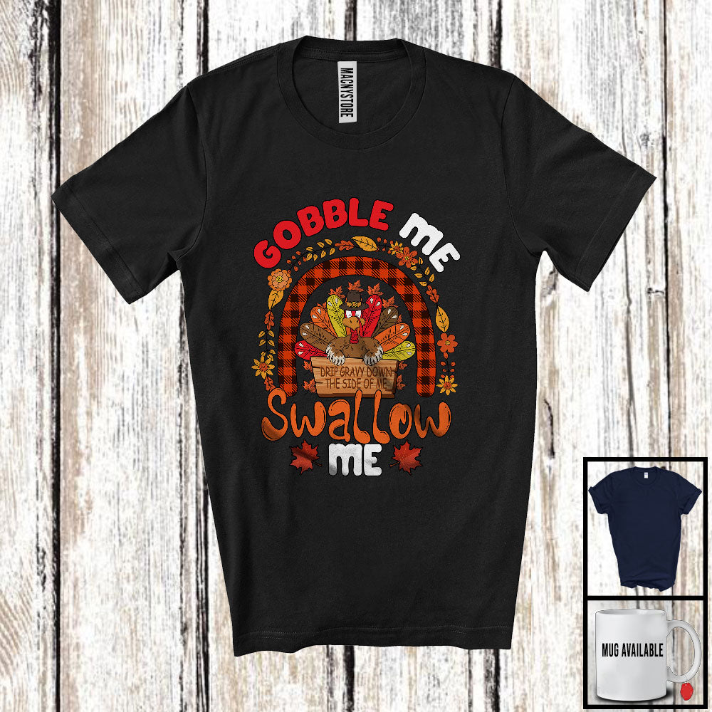 Gobble Me Swallow Me; Sarcastic Thanksgiving Family Turkey; Plaid Flowers Rainbow Dinner T-Shirt. This cotton t-shirt is a durable staple product with a classic fit. One of the most popular items, it has a relaxed style made for everyday and casual wear.