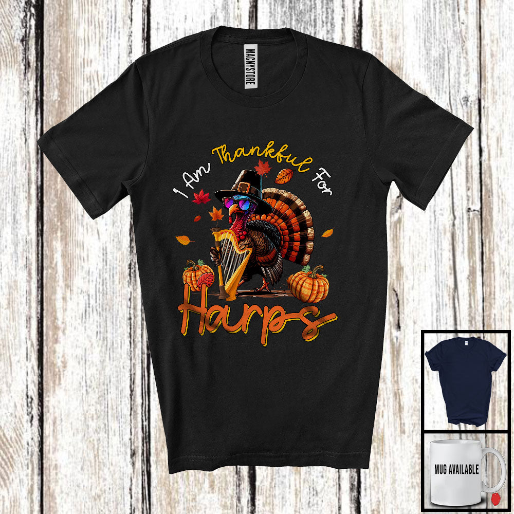• I Am Thankful For Harps; Humorous Thanksgiving Turkey Playing Musical Instruments T-Shirt. This cotton t-shirt is a durable staple product with a classic fit. One of the most popular items, it has a relaxed style made for everyday and casual wear.