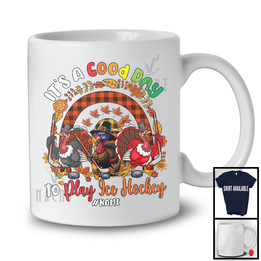 Personalized Custom Name Good Day To Play Ice Hockey; Joyful Thanksgiving Three Turkeys Rainbow T-Shirt