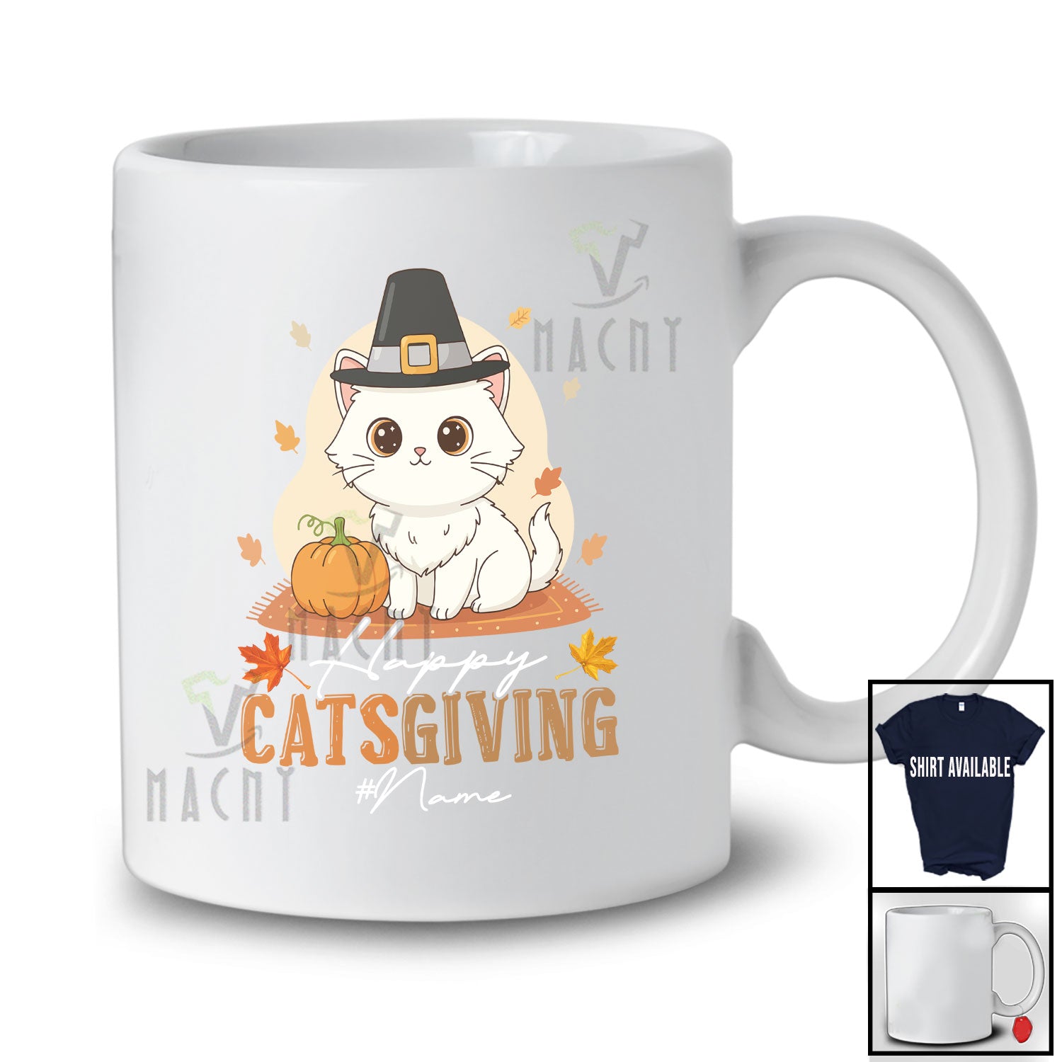• Personalized Custom Name Happy Catsgiving; Adorable Thanksgiving Pilgrim Cat Owner Pumpkin T-Shirt. This cotton t-shirt is a durable staple product with a classic fit. One of the most popular items, it has a relaxed style made for everyday and casual wear.