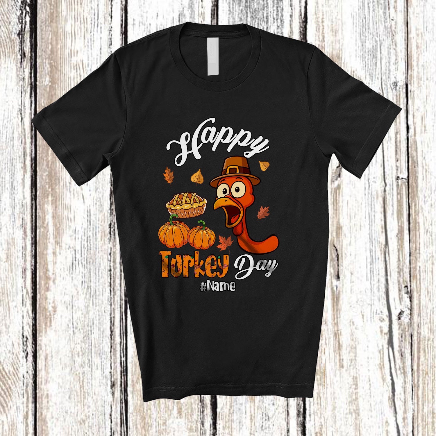 Personalized Custom Name Happy Turkey Day; Humorous Thanksgiving Turkey Face Pumpkin Pie T-Shirt. This cotton t-shirt is a durable staple product with a classic fit. One of the most popular items, it has a relaxed style made for everyday and casual wear.