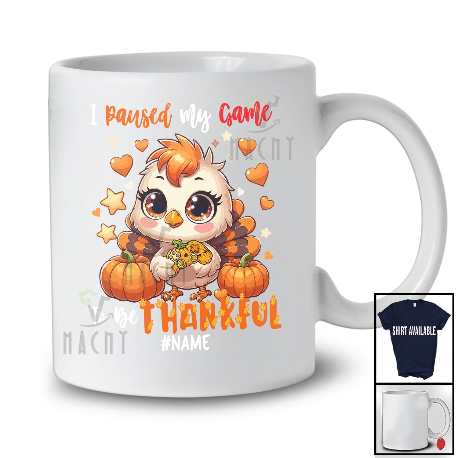 • Personalized Custom Name I Paused My Game To Be Thankful; Lovely Thanksgiving Turkey Gamer T-Shirt. This cotton t-shirt is a durable staple product with a classic fit. One of the most popular items, it has a relaxed style made for everyday and casual wear.