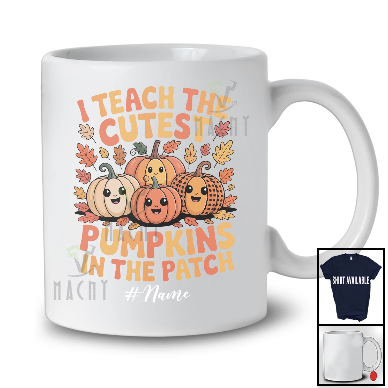 • Personalized Custom Name I Teach The Cutest Pumpkins; Lovely Thanksgiving Fall Leaves Teacher T-Shirt. This cotton t-shirt is a durable staple product with a classic fit. One of the most popular items, it has a relaxed style made for everyday and casual wear.