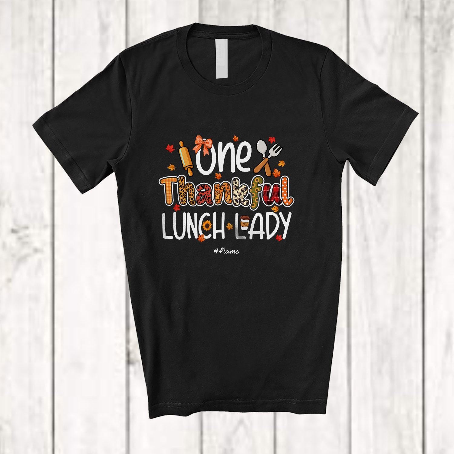 • Personalized Custom Name One Thankful Lunch Lady; Awesome Thanksgiving Leopard Plaid Coffee T-Shirt. This cotton t-shirt is a durable staple product with a classic fit. One of the most popular items, it has a relaxed style made for everyday and casual wear.