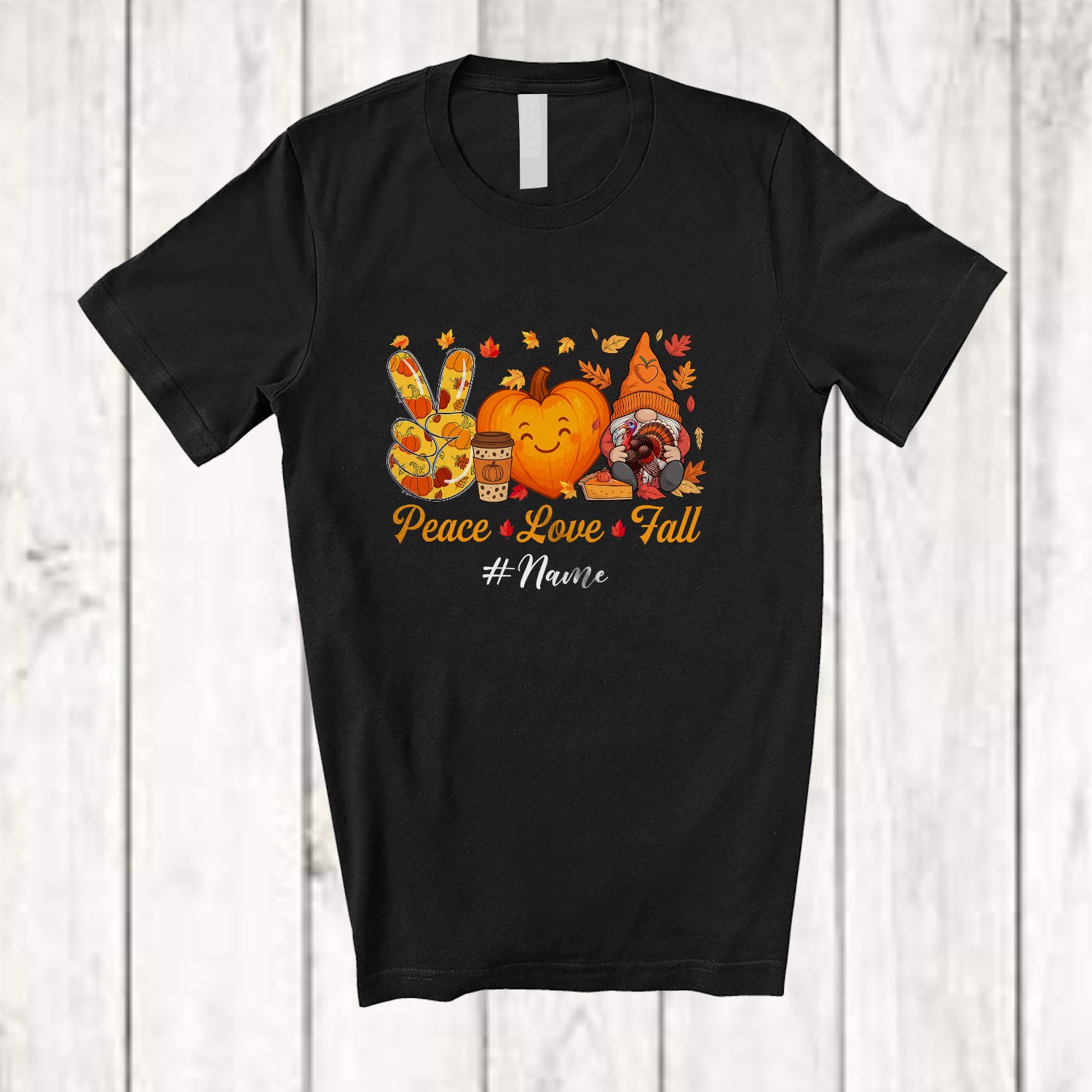 Personalized Custom Name Peace Love Fall; Amusing Thanksgiving Hand Sign Pumpkin Heart Gnome T-Shirt