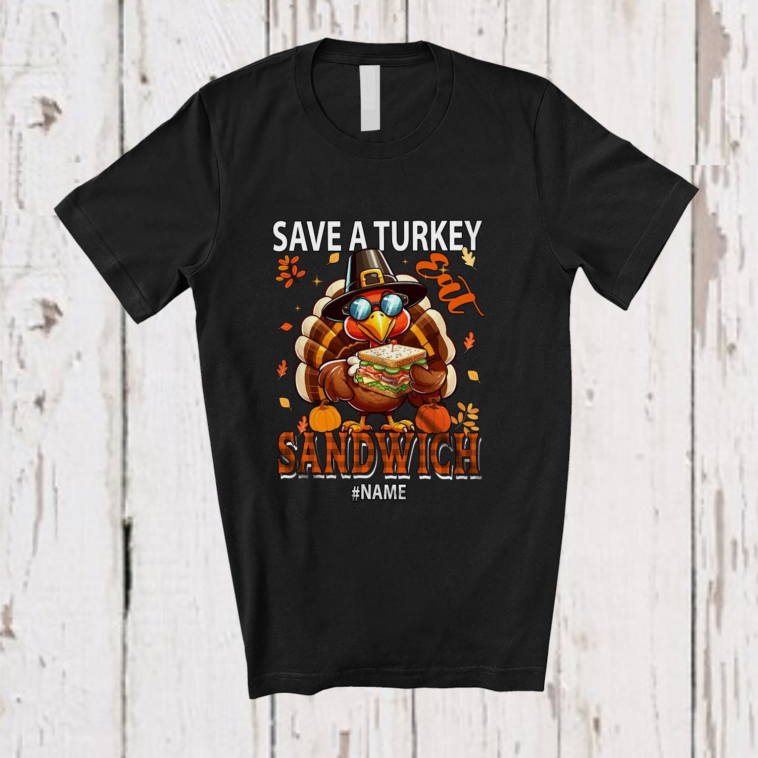 • Personalized Custom Name Save A Turkey Eat Sandwich; Humorous Thanksgiving Food Lover T-Shirt. This cotton t-shirt is a durable staple product with a classic fit. One of the most popular items, it has a relaxed style made for everyday and casual wear.