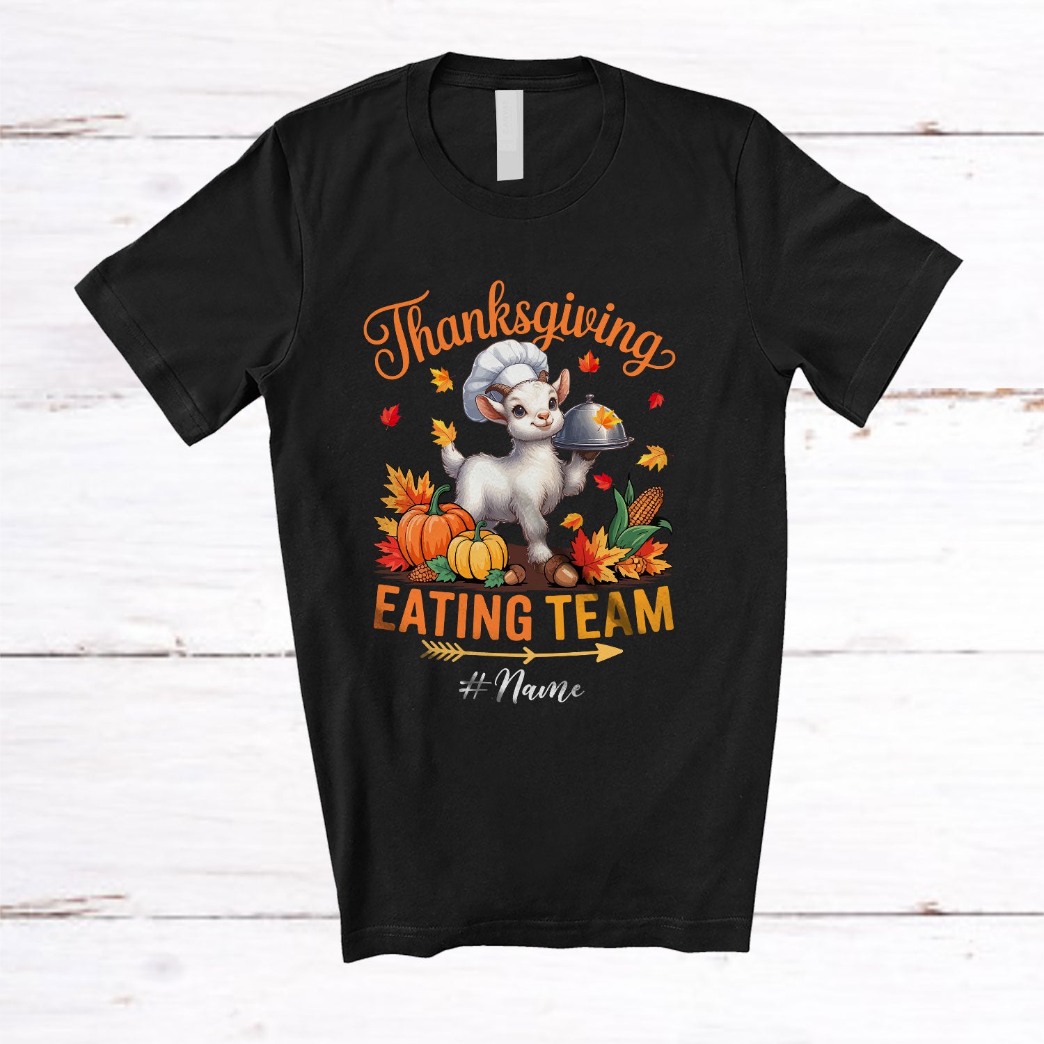 Personalized Custom Name Thanksgiving Eating Team; Lovely Fall Leaves Goat Farmer Family T-Shirt. This cotton t-shirt is a durable staple product with a classic fit. One of the most popular items, it has a relaxed style made for everyday and casual wear.