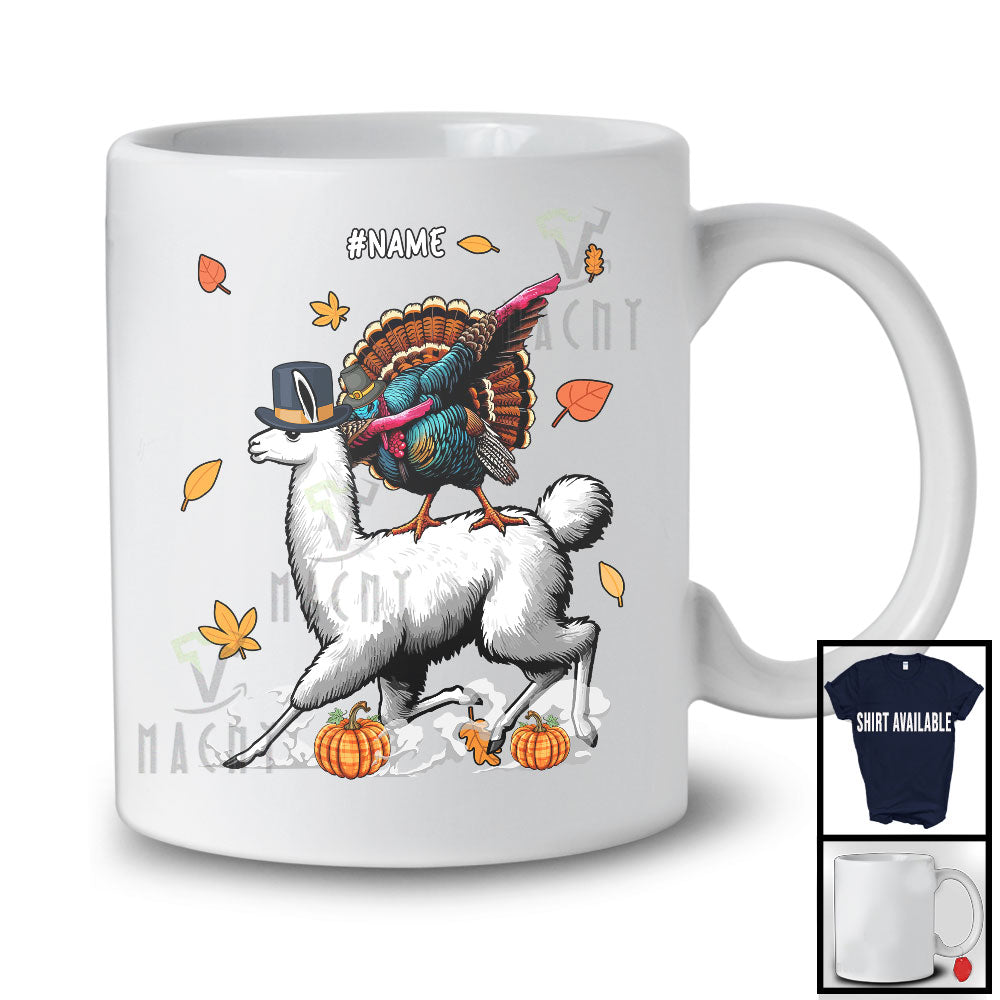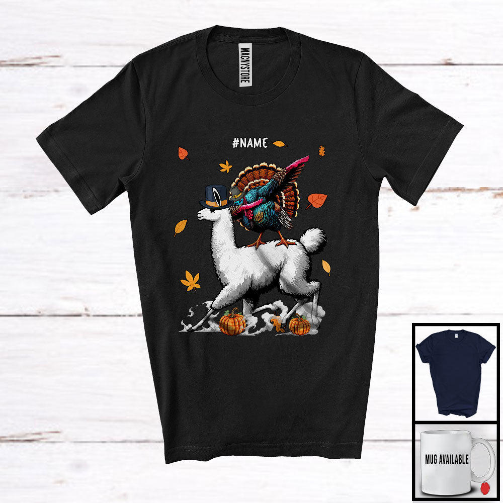 Personalized Dabbing Turkey Riding Llama; Humorous Thanksgiving Farm; Custom Name Farmer T-Shirt