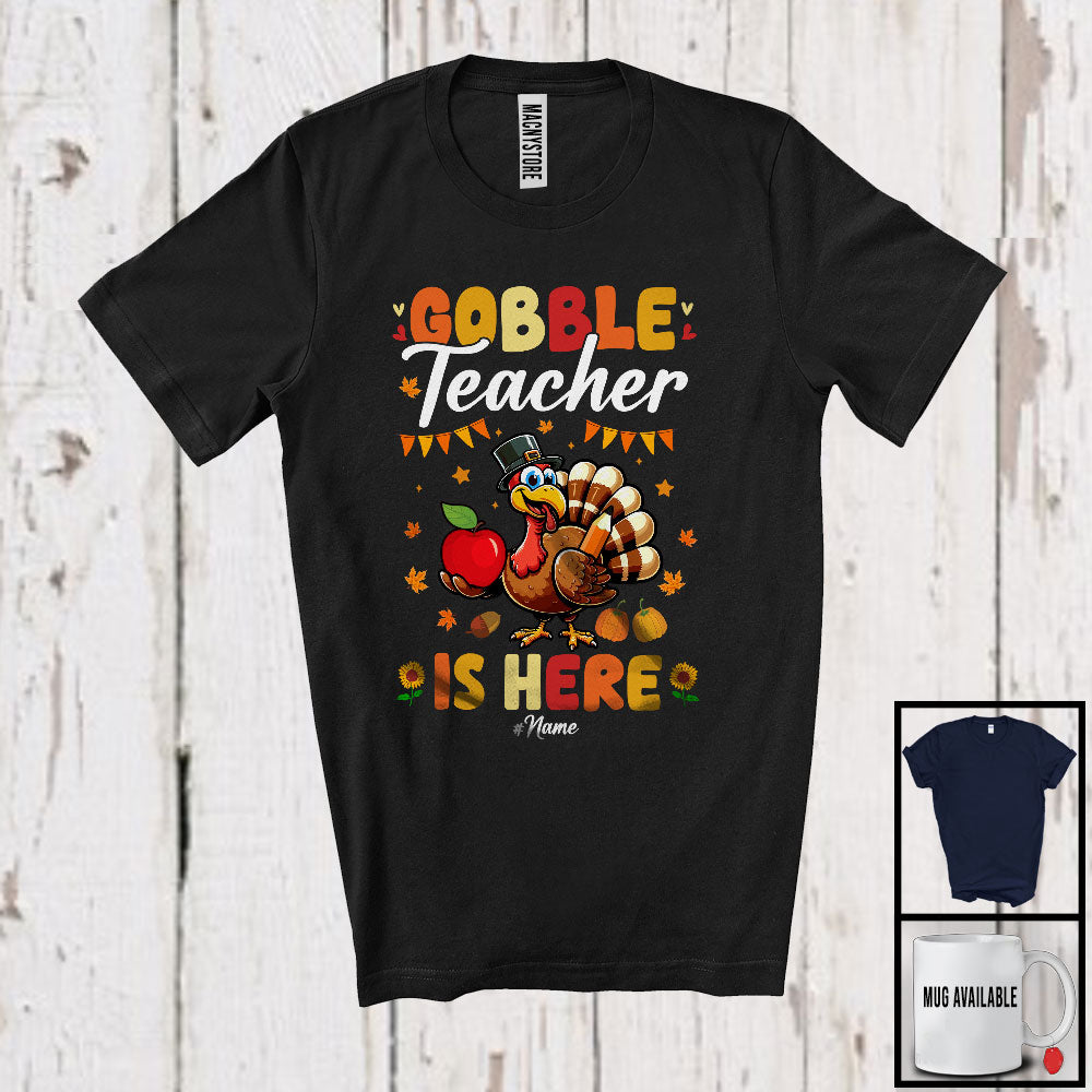 This Personalized Gobble Teacher Is Here; Humorous Thanksgiving Turkey Teacher; Custom Name Jobs T-Shirt is great idea gift for your family, friends in this birthday, christmas, mother's day, father's day, patrick's day or any holiday.