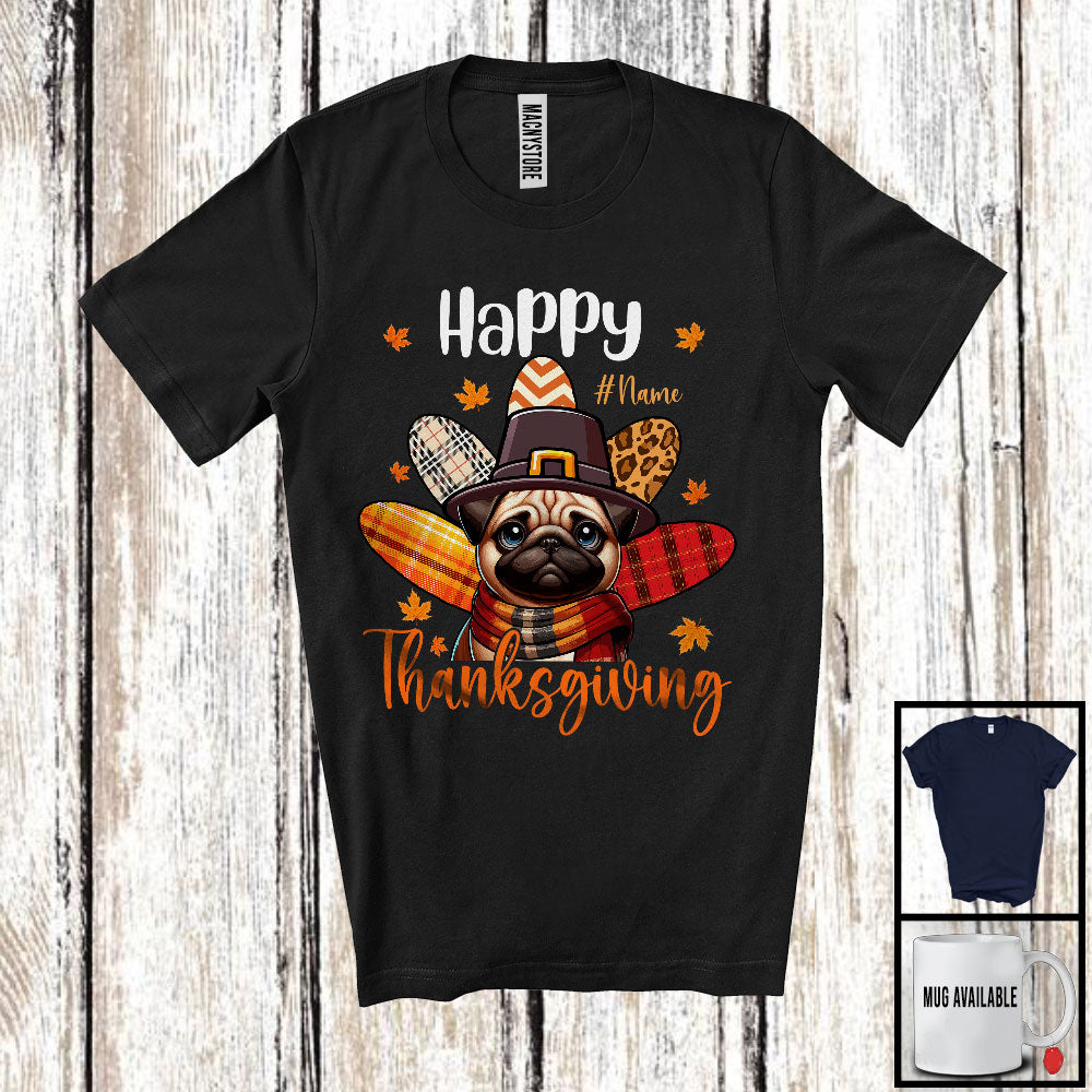 Personalized Happy Thanksgiving; Adorable Custom Name Pug Plaid Turkey Tail; Family T-Shirt. This cotton t-shirt is a durable staple product with a classic fit. One of the most popular items, it has a relaxed style made for everyday and casual wear.