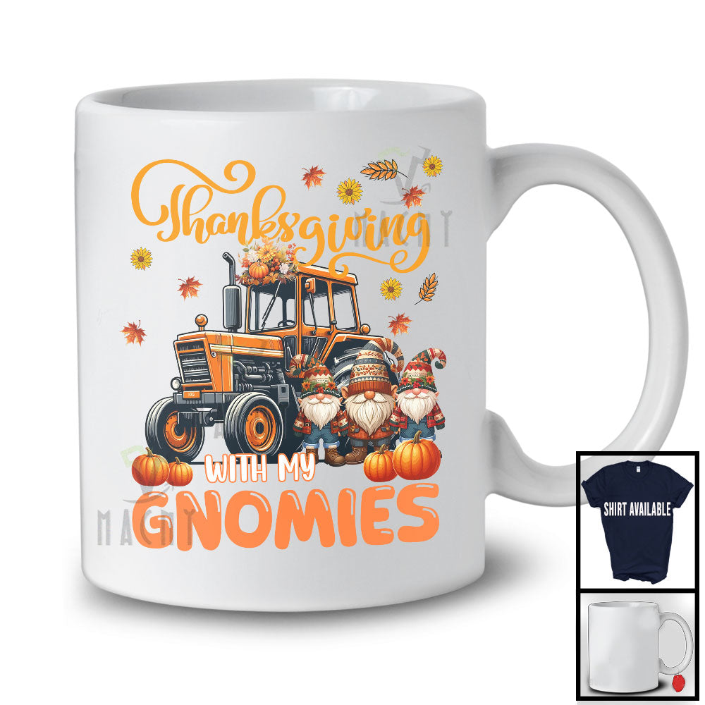 • Thanksgiving With My Gnomies, Adorable Three Gnomes With Tractor, Fall Leaves Pumpkins T-Shirt. This cotton t-shirt is a durable staple product with a classic fit. One of the most popular items, it has a relaxed style made for everyday and casual wear.