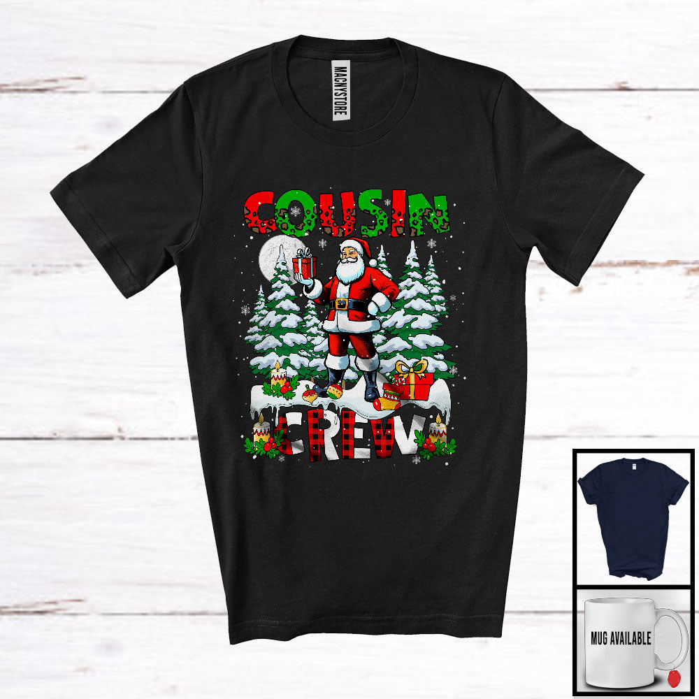 Cousin Crew; Adorable Christmas Tree Moon Santa; Leopard Plaid Matching Elf Family Group T-Shirt. This cotton t-shirt is a durable staple product with a classic fit. One of the most popular items, it has a relaxed style made for everyday and casual wear.