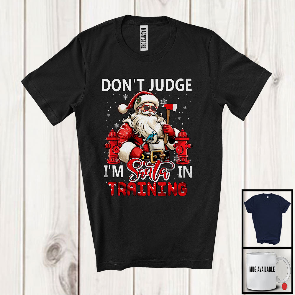 Don't Judge I'm Santa In Training; Sarcastic Christmas Firefighter Santa; Snowing X-mas Family T-Shirt. This cotton t-shirt is a durable staple product with a classic fit. One of the most popular items, it has a relaxed style made for everyday and casual wear.