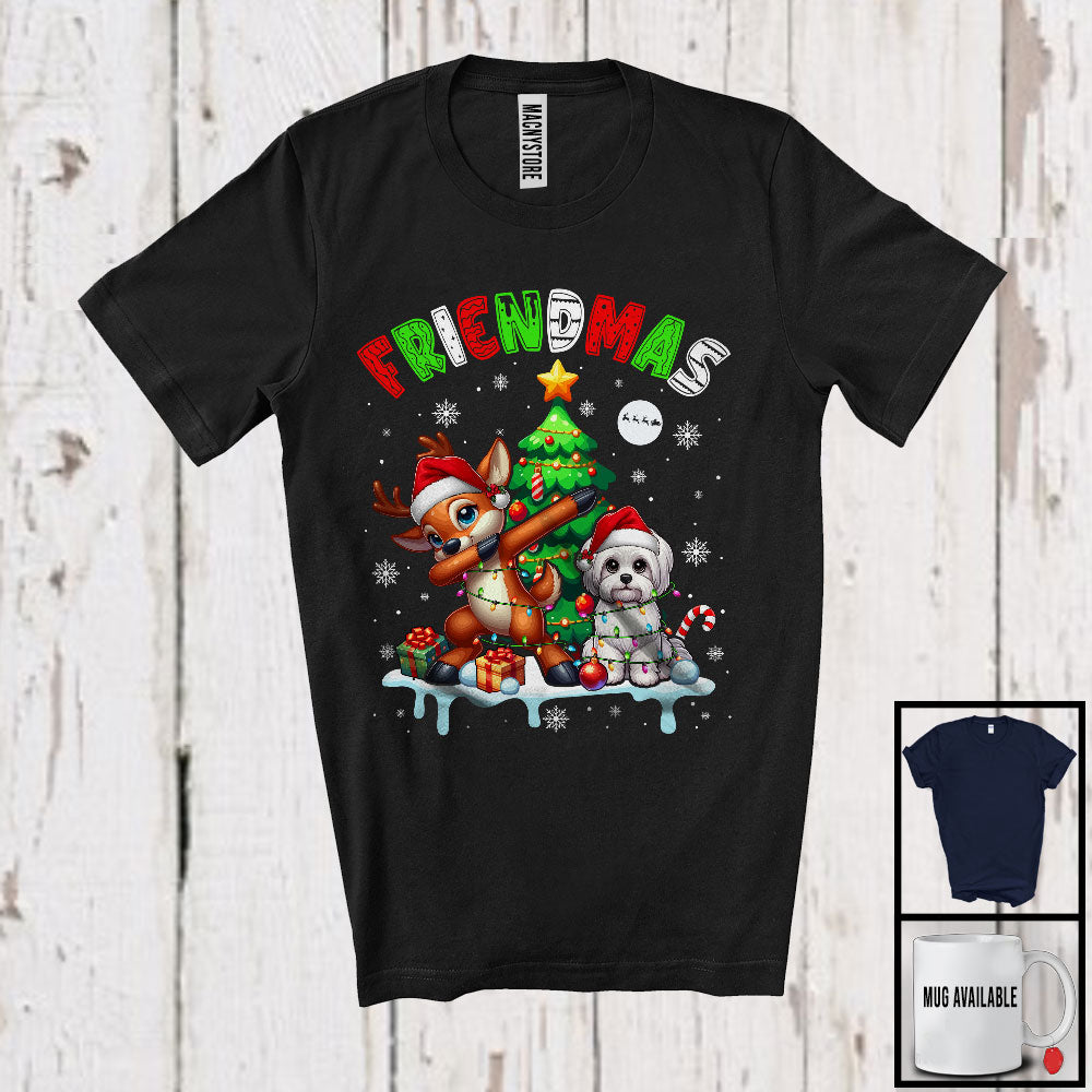 new MacnyStore - Friendmas; Joyful Christmas Tree Santa Maltese Owner; X-mas Lights Dabbing Reindeer T-Shirt – Macnystore