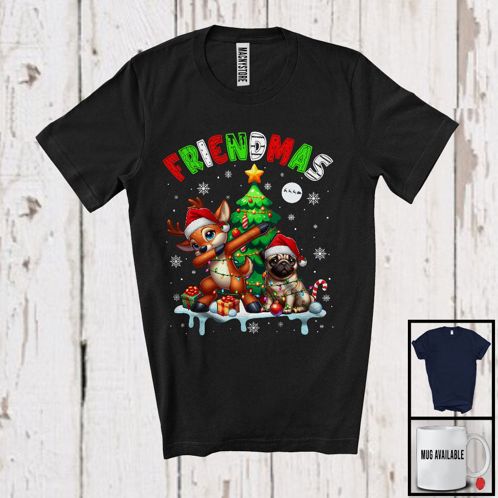 Friendmas; Joyful Christmas Tree Santa Pug Owner; X-mas Lights Dabbing Reindeer T-Shirt