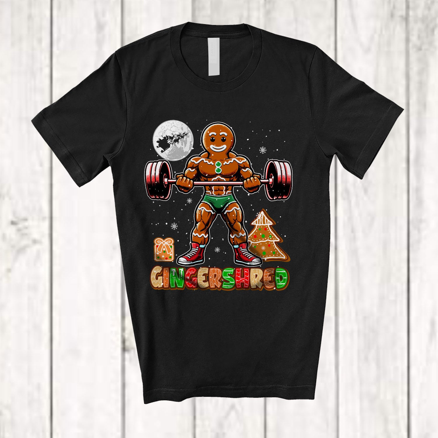 • Gingershred; Adorable Christmas Gingerbread Man Weightlifting; Workout Bodybuilding Family T-Shirt. This cotton t-shirt is a durable staple product with a classic fit. One of the most popular items, it has a relaxed style made for everyday and casual wear.