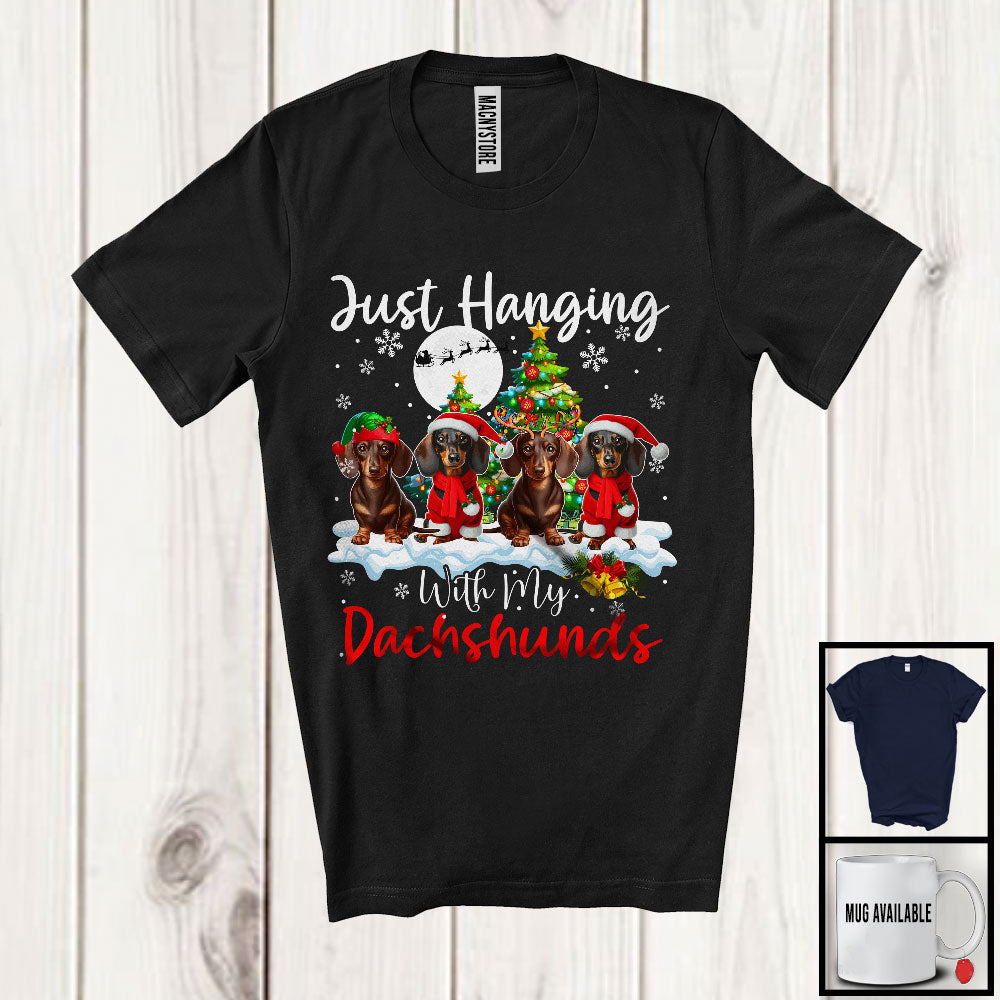 Just Hanging With My Dachshunds; Adorable Christmas Tree Snowing; X-mas Animal Lover T-Shirt. This cotton t-shirt is a durable staple product with a classic fit. One of the most popular items, it has a relaxed style made for everyday and casual wear.