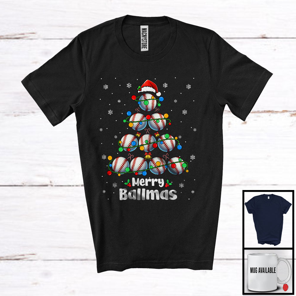 Merry Ballmas; Awesome Christmas Lights Tree Baseball; X-mas Santa Baseball Sport Player T-Shirt. This cotton t-shirt is a durable staple product with a classic fit. One of the most popular items, it has a relaxed style made for everyday and casual wear.