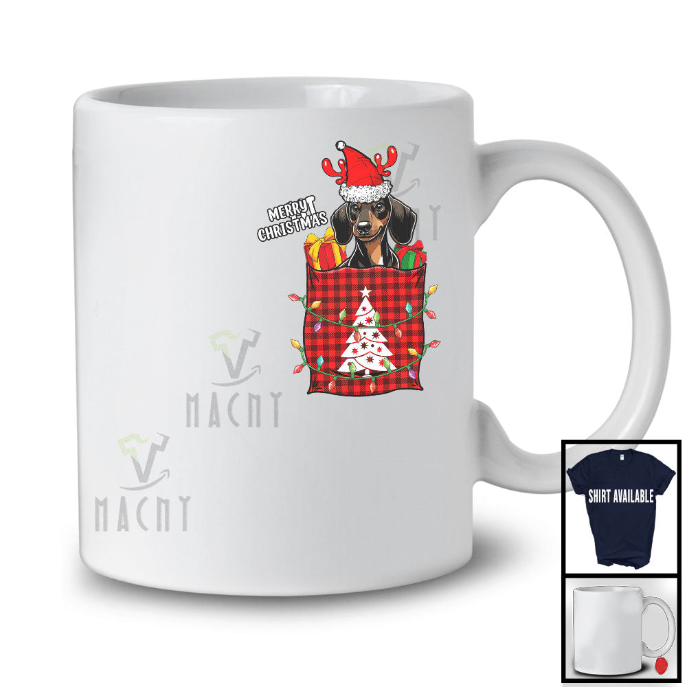 Merry Christmas; Amusing X-mas Lights Santa Reindeer Dachshund In Plaid Pocket; Family T-Shirt. This cotton t-shirt is a durable staple product with a classic fit. One of the most popular items, it has a relaxed style made for everyday and casual wear.