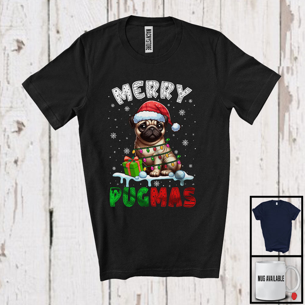 The Merry Pugmas; Adorable Christmas Santa Pug; X-mas Lights Snowing Family Group T-Shirt is evocative, to say the least, but that's why you're drawn to it in the first place.
