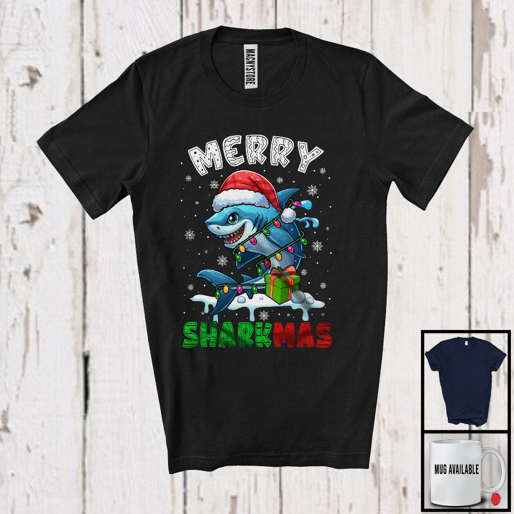 new MacnyStore - Merry Sharkmas; Adorable Christmas Santa Shark Animal; X-mas Lights Snowing Family Group T-Shirt – Macnystore