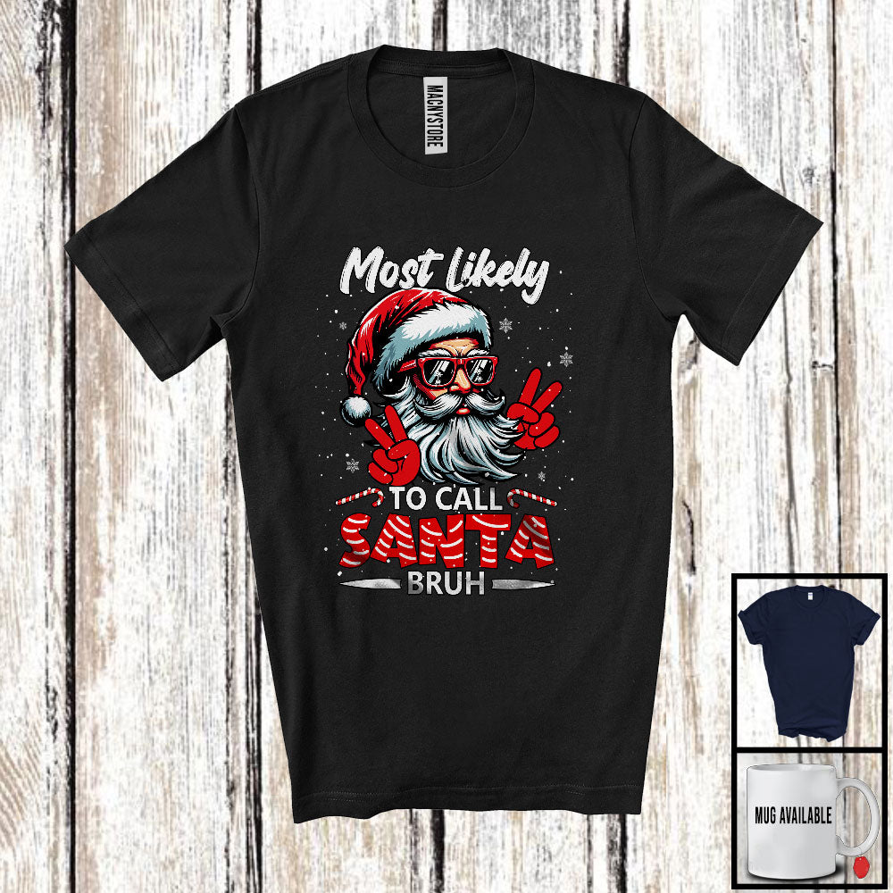 • Most Likely To Call Santa Bruh; Sarcastic Christmas Santa Face Snow Around; Family Group T-Shirt. This cotton t-shirt is a durable staple product with a classic fit. One of the most popular items, it has a relaxed style made for everyday and casual wear.