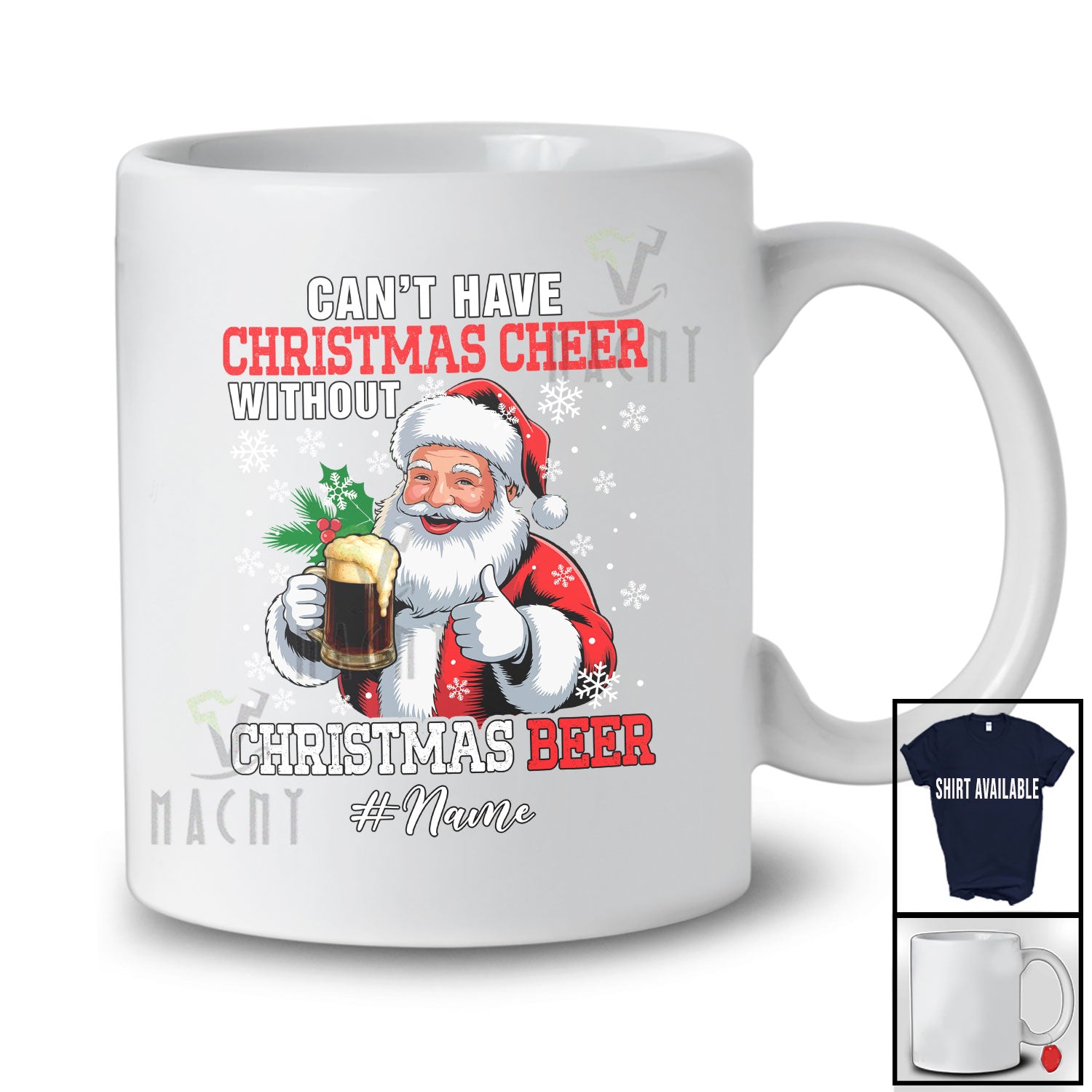 Personalized Custom Name Can't Have Christmas Cheer Without Beer; Joyful Santa Drinking Dark Beer T-Shirt. This cotton t-shirt is a durable staple product with a classic fit. One of the most popular items, it has a relaxed style made for everyday and casual wear.
