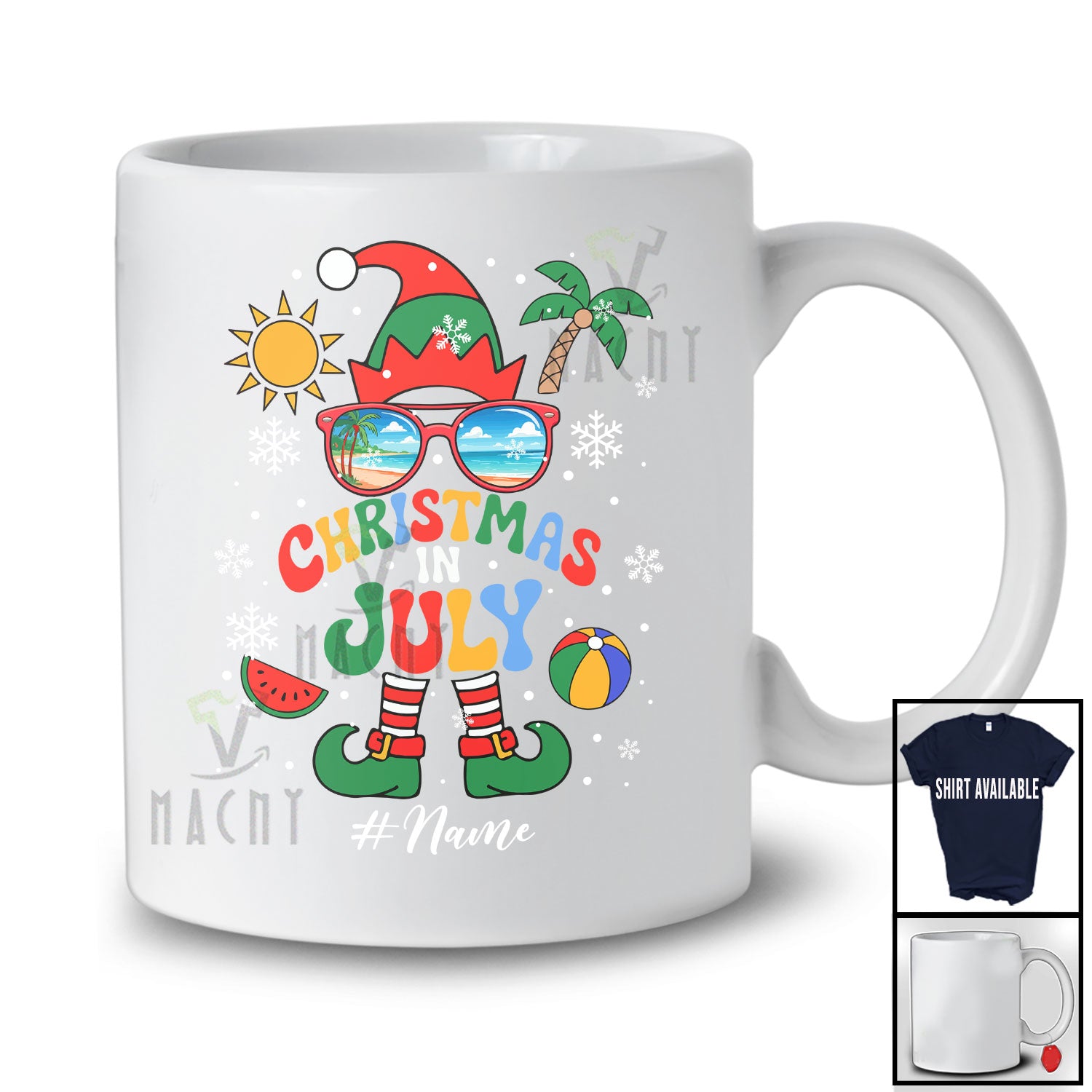 Personalized Custom Name Christmas In July; Lovely Summer Vacation Elf Sunglasses; Hawaiian T-Shirt. This cotton t-shirt is a durable staple product with a classic fit. One of the most popular items, it has a relaxed style made for everyday and casual wear.