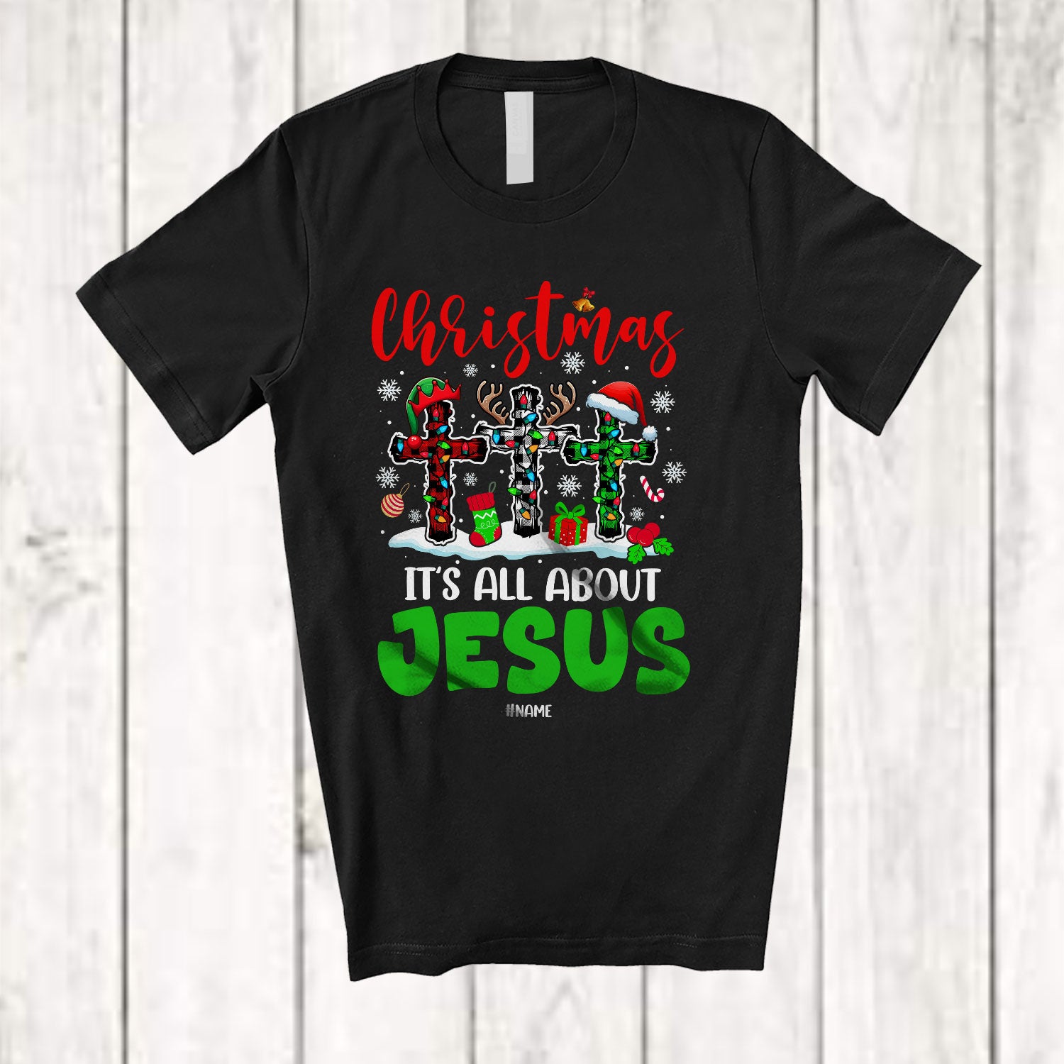 Personalized Custom Name Christmas It's All About Jesus; Joyful X-mas Three Plaid Cross; Family T-Shirt. This cotton t-shirt is a durable staple product with a classic fit. One of the most popular items, it has a relaxed style made for everyday and casual wear.