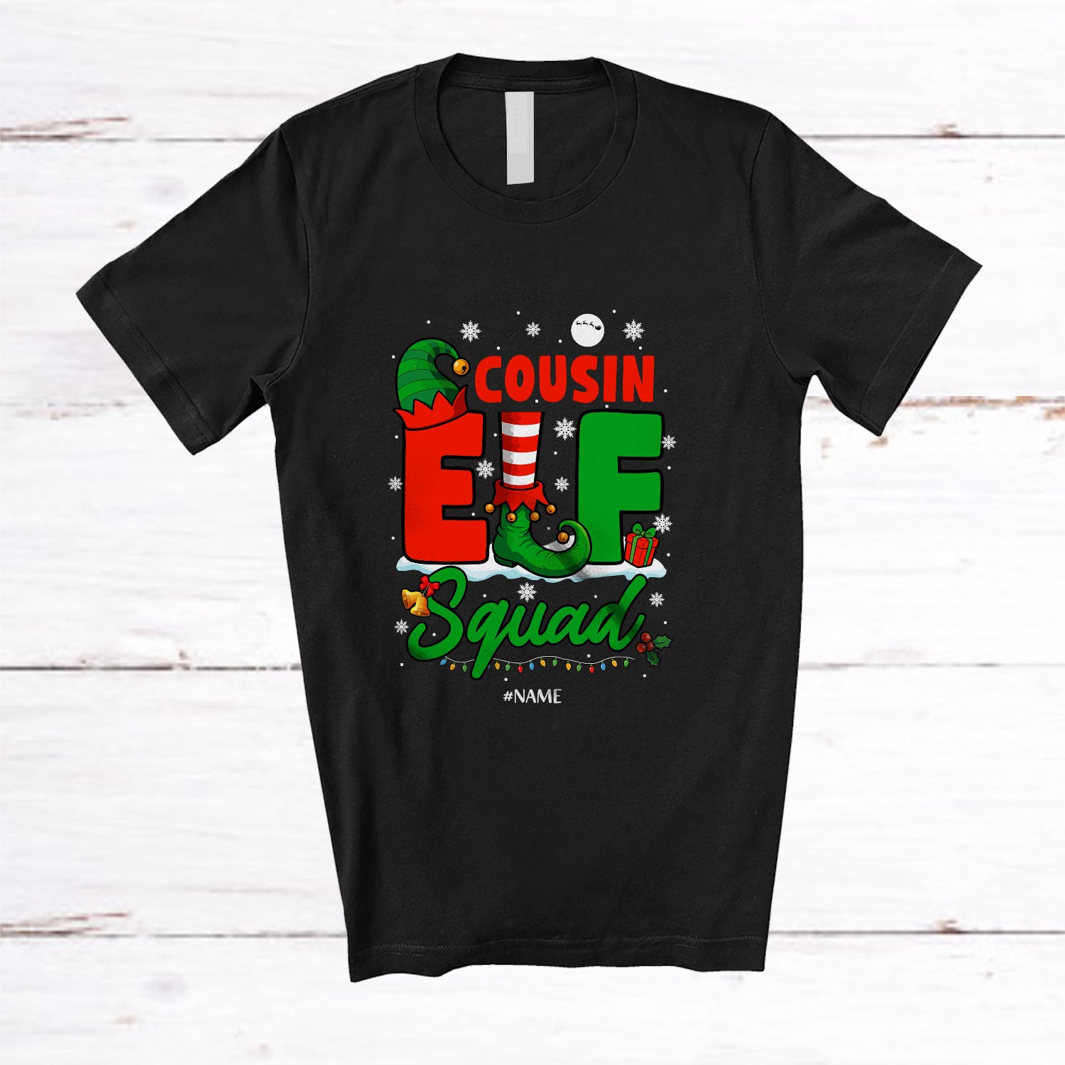 • Personalized Custom Name Cousin Elf Squad; Humorous Christmas Elf Shoes Snowing; Pajama Family T-Shirt. This cotton t-shirt is a durable staple product with a classic fit. One of the most popular items, it has a relaxed style made for everyday and casual wear.