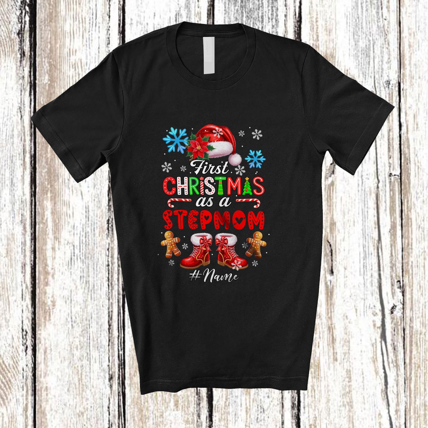 Personalized Custom Name First Christmas As A Stepmom; Joyful Santa Promoting Future; Family T-Shirt