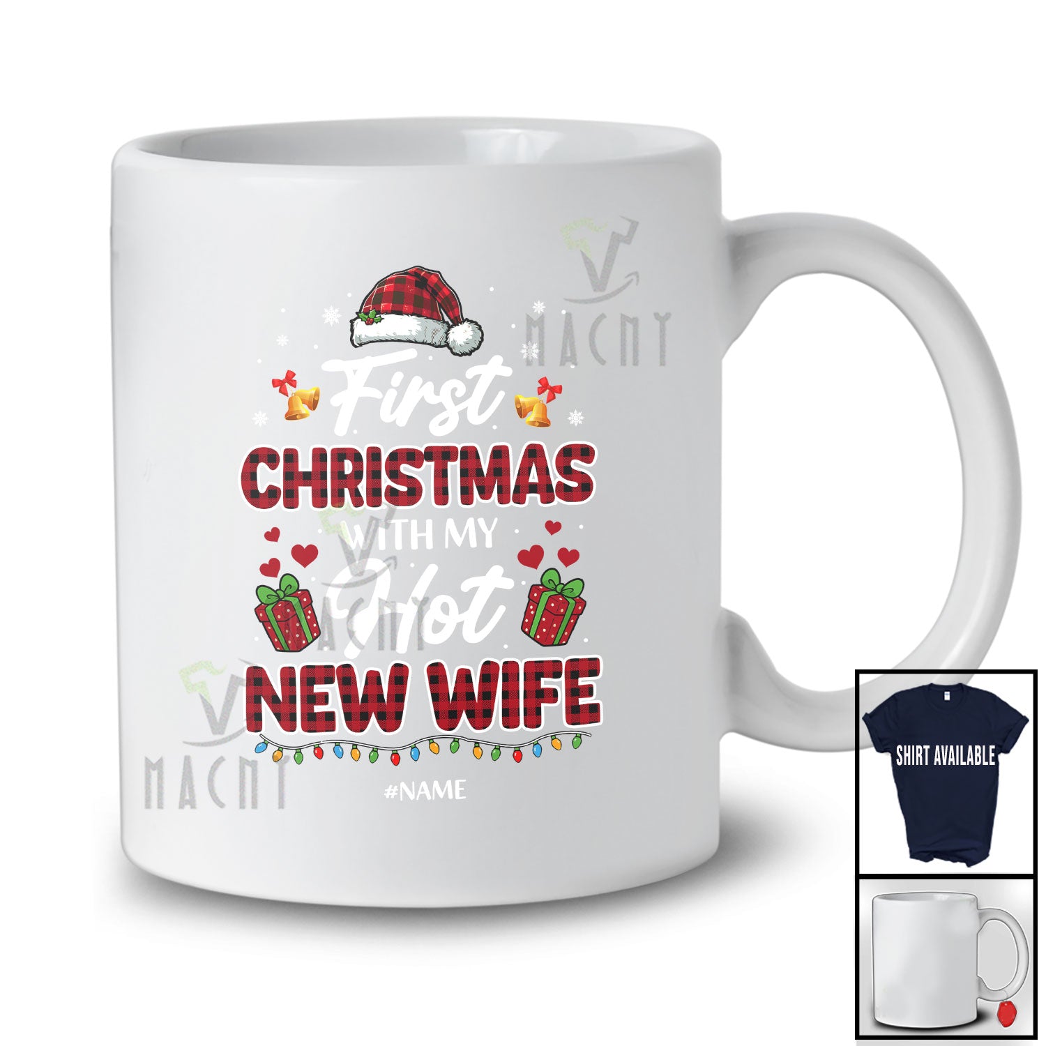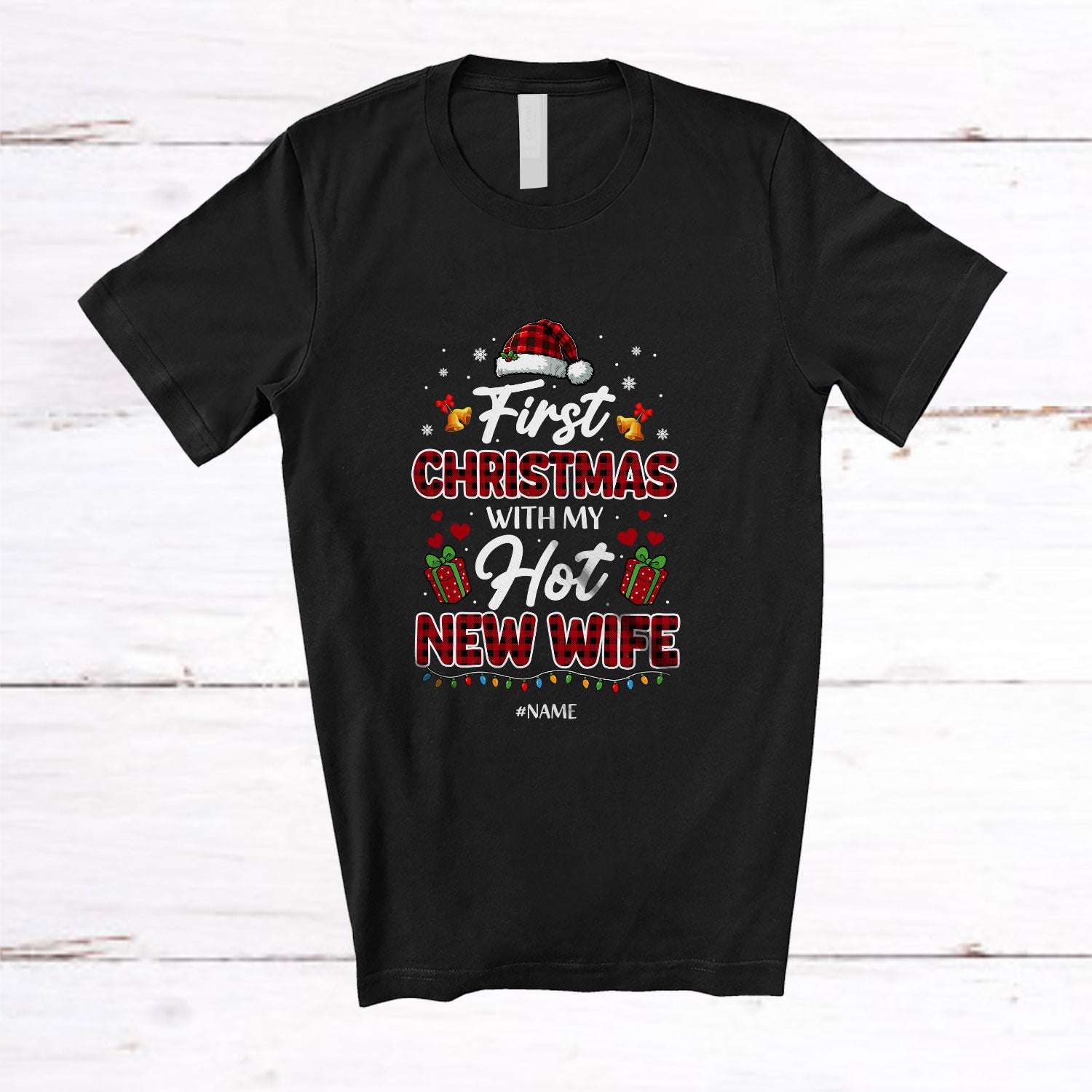 Personalized Custom Name First Christmas With My Hot New Wife; Amusing Plaid Santa Couple T-Shirt. This cotton t-shirt is a durable staple product with a classic fit. One of the most popular items, it has a relaxed style made for everyday and casual wear.
