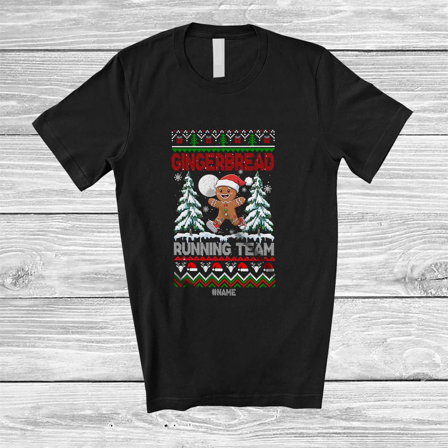 Personalized Custom Name Gingerbread Running Team; Amusing Christmas Tree Sweater Runner T-Shirt. This cotton t-shirt is a durable staple product with a classic fit. One of the most popular items, it has a relaxed style made for everyday and casual wear.