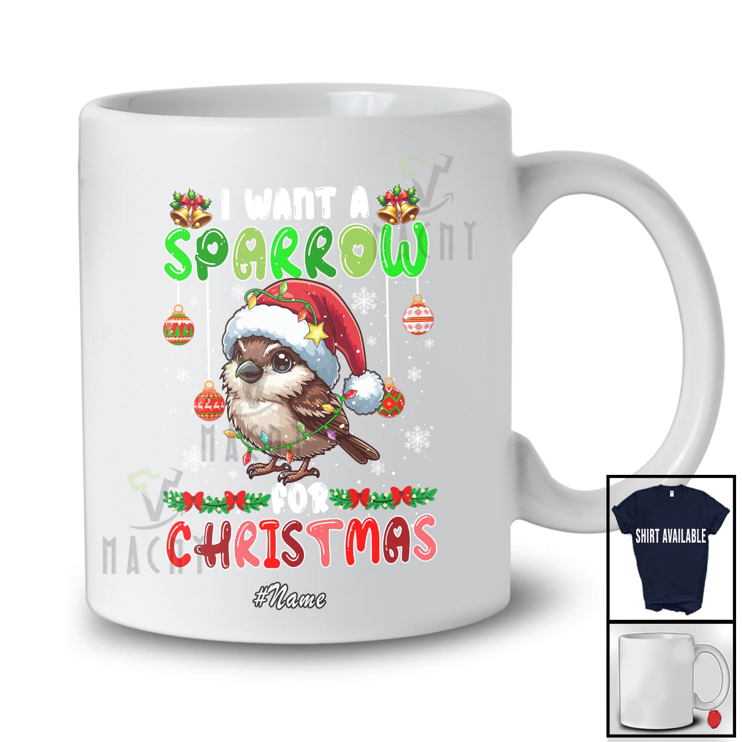 Personalized Custom Name I Want A Sparrow For Christmas; Lovely Santa Bird X-mas Lights T-Shirt. This cotton t-shirt is a durable staple product with a classic fit. One of the most popular items, it has a relaxed style made for everyday and casual wear.