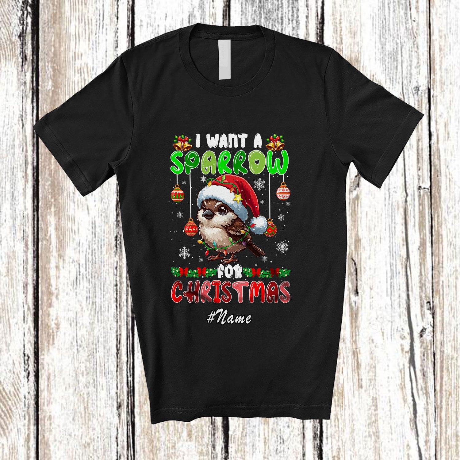 Personalized Custom Name I Want A Sparrow For Christmas; Lovely Santa Bird X-mas Lights T-Shirt