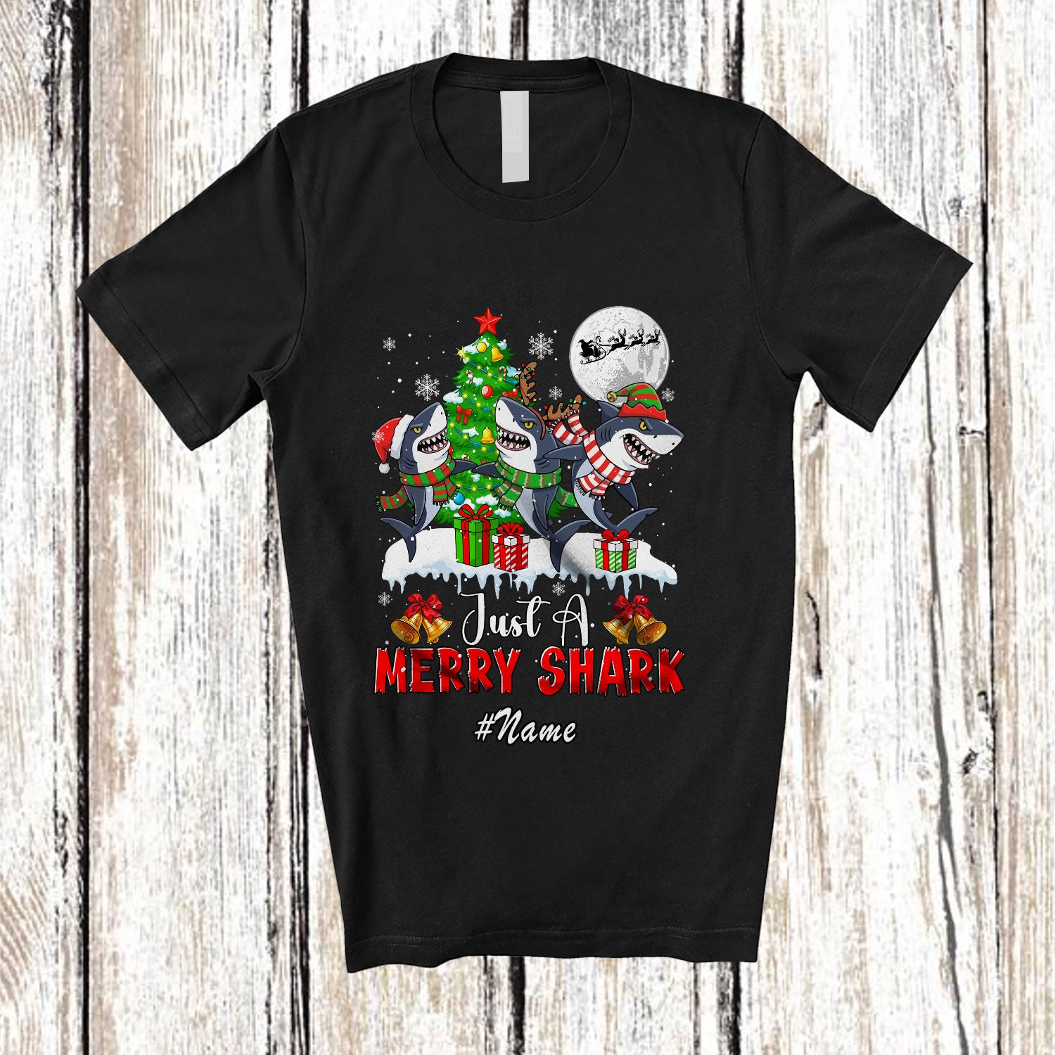 The Personalized Custom Name Just A Merry Shark; Lovely Christmas Three Santa Elf Shark X-mas Tree T-Shirt destined to impress, and priced at only $12.95, for a limited time.