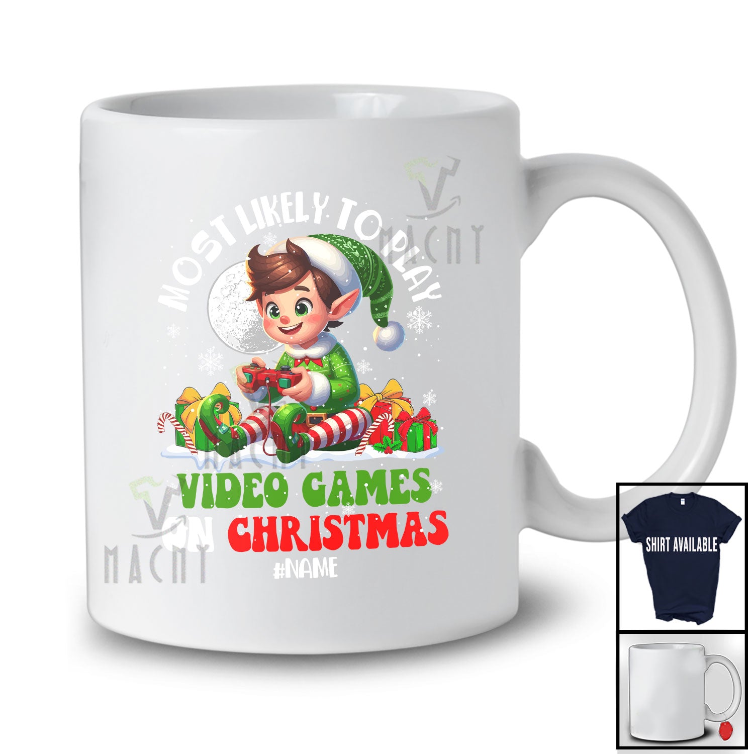 • Personalized Custom Name Likely To Play Video Games On Christmas; Amusing Elf Gaming Gamer T-Shirt. This cotton t-shirt is a durable staple product with a classic fit. One of the most popular items, it has a relaxed style made for everyday and casual wear.