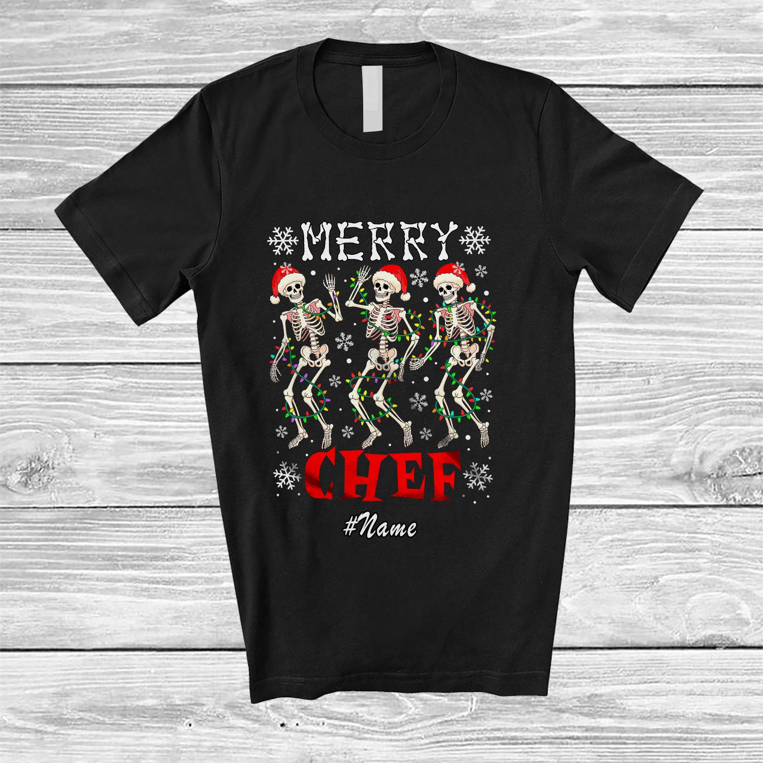 Personalized Custom Name Merry Chef; Joyful Christmas Lights Three Santa Dancing Jobs T-Shirt