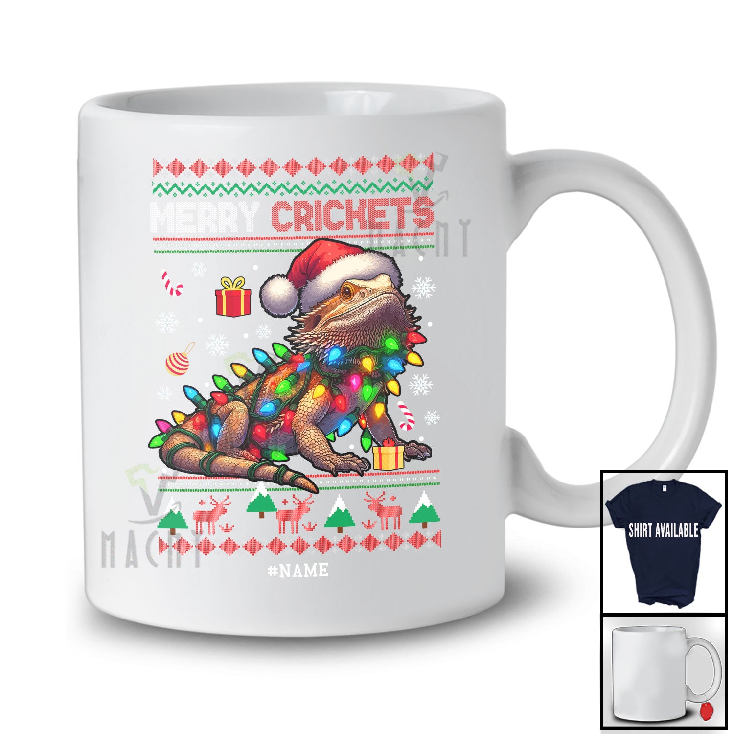 Personalized Custom Name Merry Crickets; Joyful Christmas Lights Sweater Bearded Dragon T-Shirt. This cotton t-shirt is a durable staple product with a classic fit. One of the most popular items, it has a relaxed style made for everyday and casual wear.
