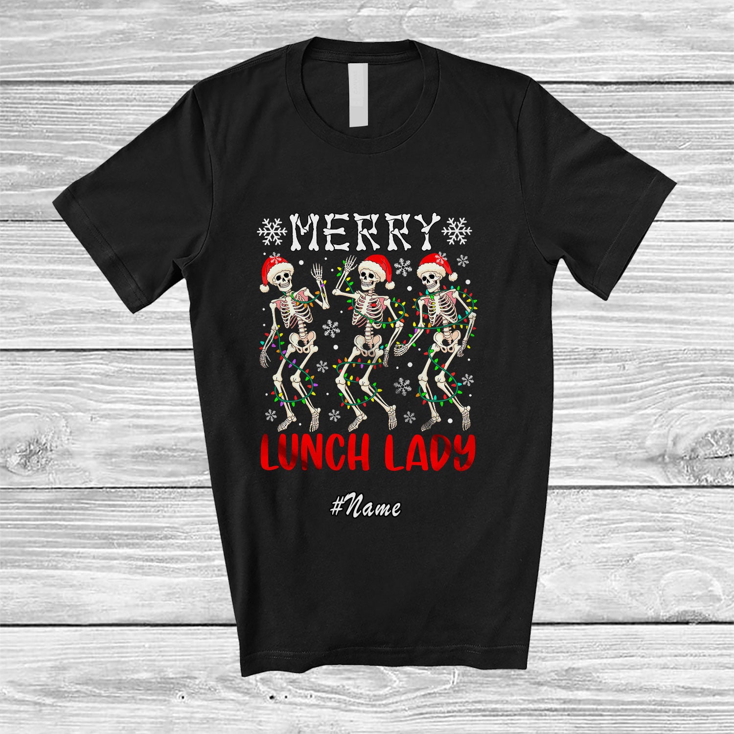 Personalized Custom Name Merry Lunch Lady; Joyful Christmas Lights Three Santa Dancing T-Shirt