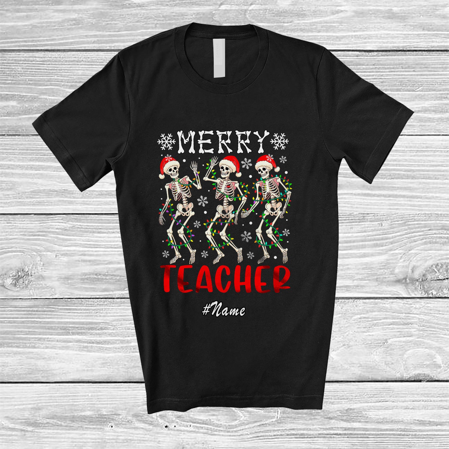 Personalized Custom Name Merry Teacher; Joyful Christmas Lights Three Santa Dancing T-Shirt