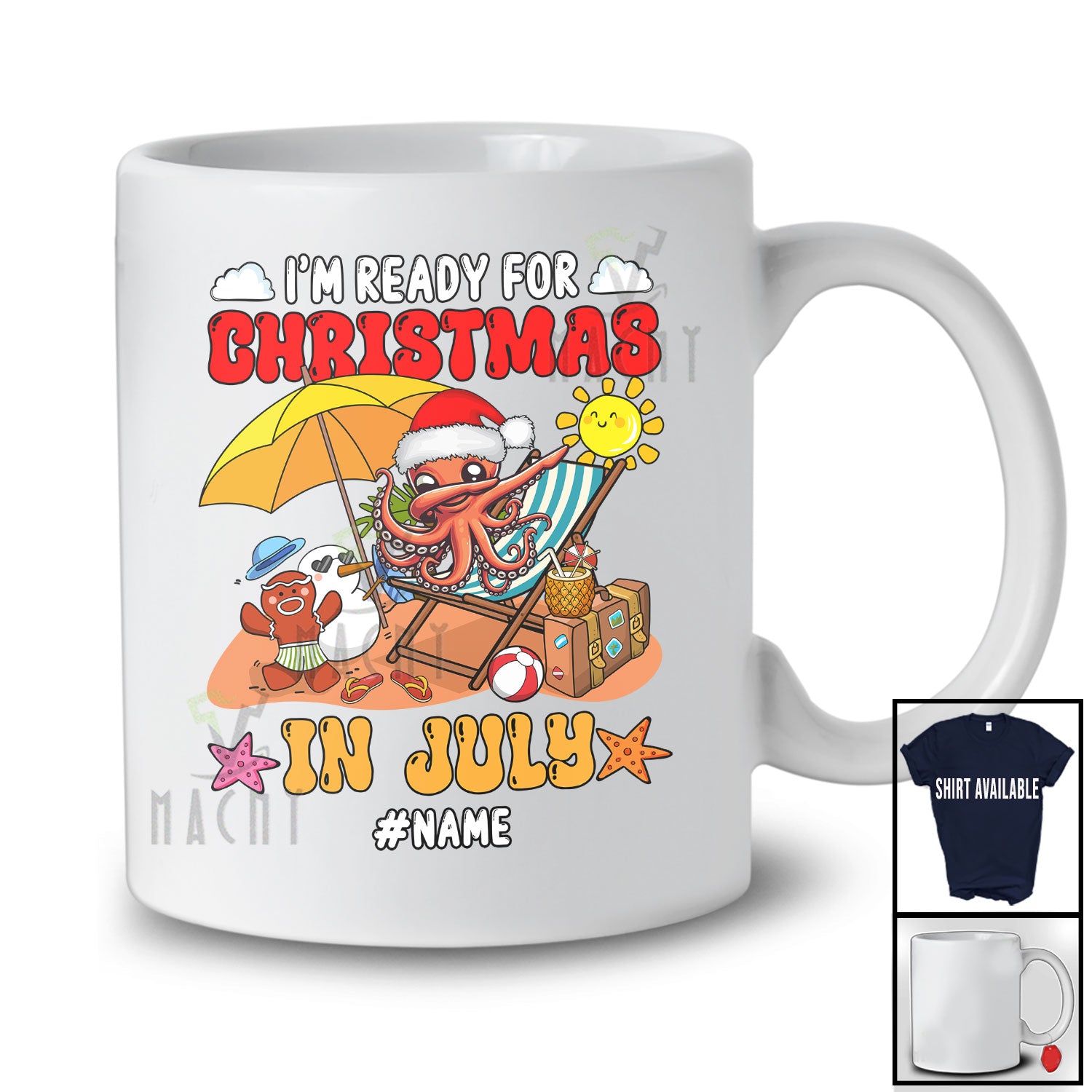 Personalized Custom Name Ready For Christmas In July; Lovely Summer Vacation Octopus Sea Animal T-Shirt. This cotton t-shirt is a durable staple product with a classic fit. One of the most popular items, it has a relaxed style made for everyday and casual wear.